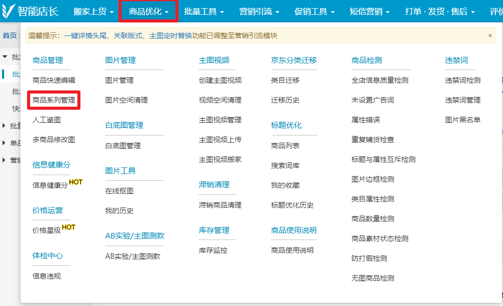 路径:进入智能店长--商品优化--商品管理--商品系列管理