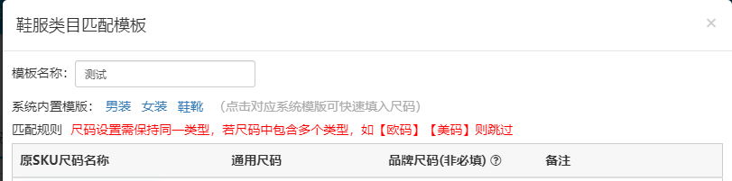 手动新增模板需要设置原SKU尺码名称、通用尺码、品牌尺码来进行匹配,当然也可以选择系统自动的模版。