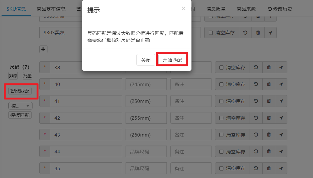 方式一:选择智能匹配--点击开始匹配,由系统运用算法,帮助商家自动生成通用尺码、品牌尺码等信息
