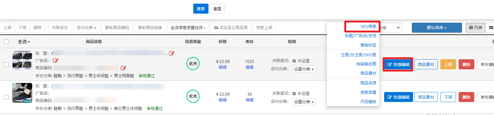 鼠标移动至快捷编辑按钮,并点击选择SKU信息