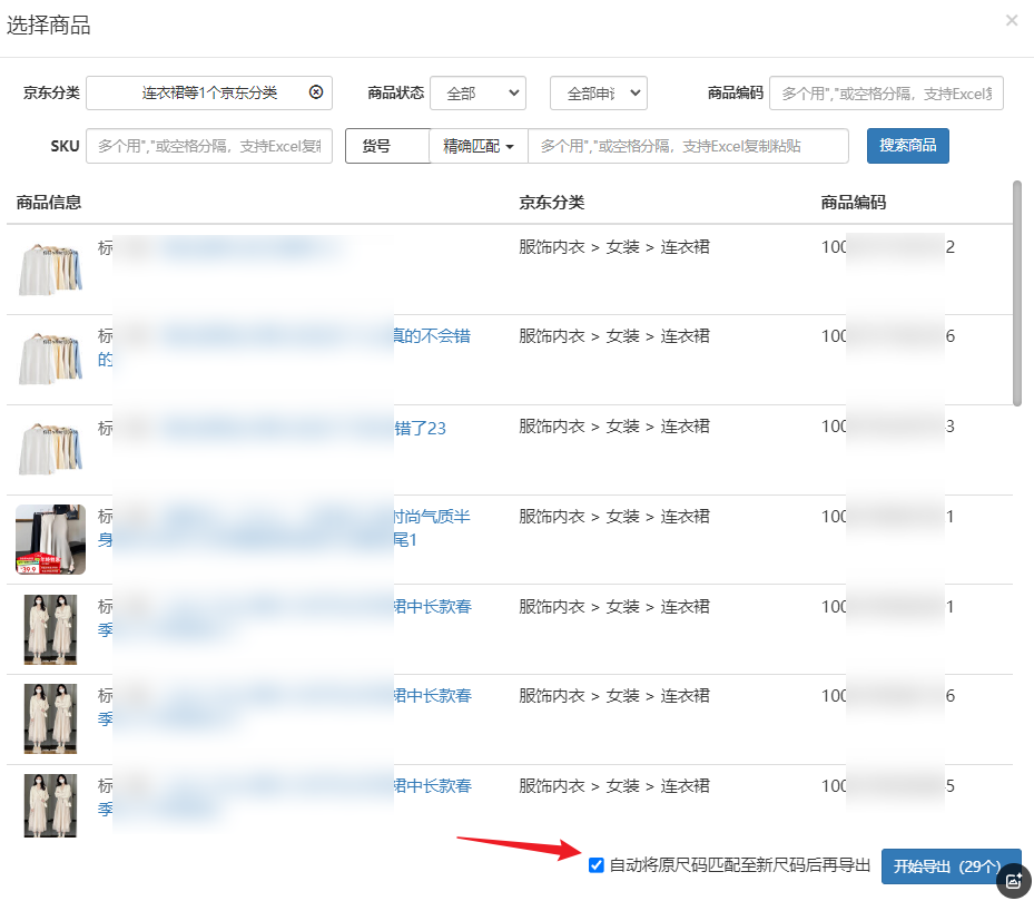 2.系统默认勾选 自动将原尺码匹配至新尺码后再导出 (系统会自动获取旧的尺码,并且自动映射匹配生成新的尺码)建议勾选