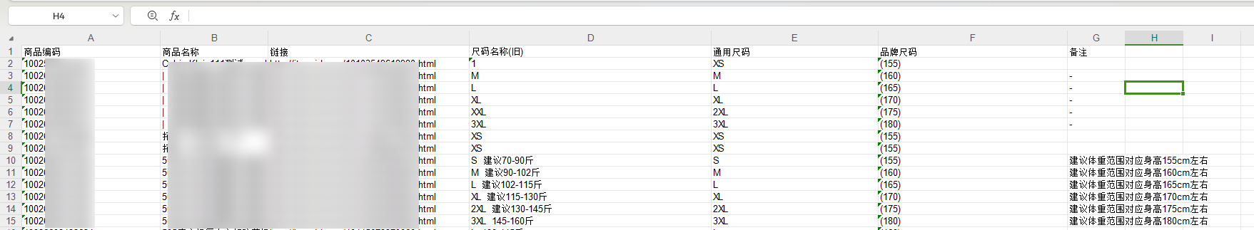 3.下载exce表格,确认表格中系统自动生成的通用尺码与品牌尺码等信息是否符合需求,如下图所示