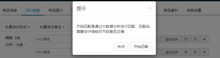 (类目不支持的商品提示无需要匹配的销售属性、匹配规则有误,如原SKU尺码名称有误,则提示匹配模板出错)