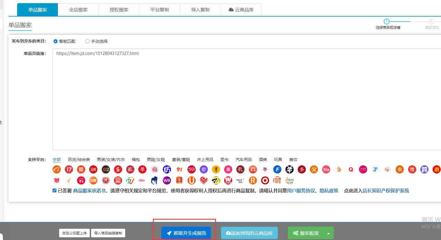 选择搬家商品,粘贴货源链接后选择抓取并生成预览审核页面