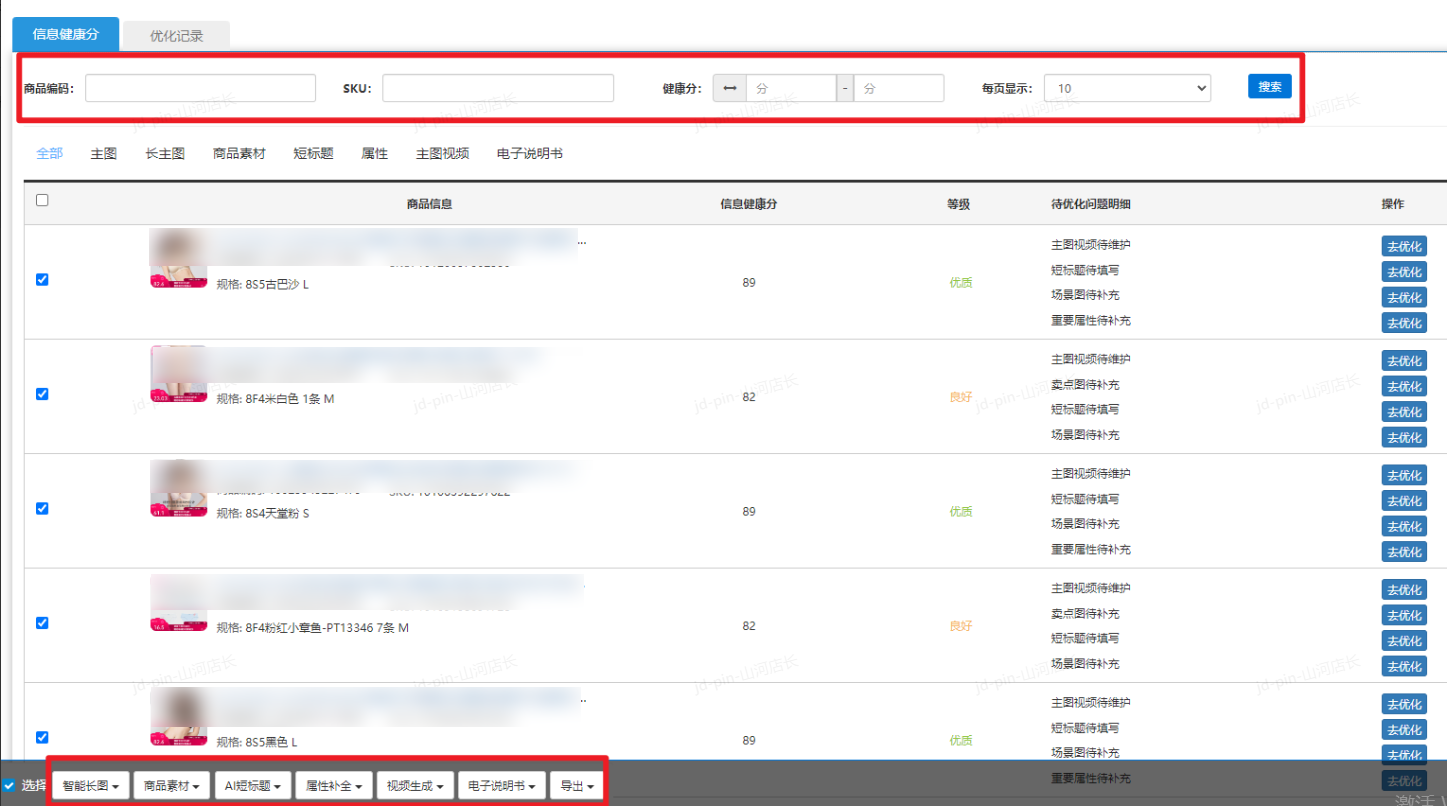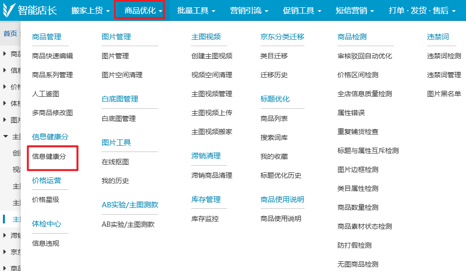 功能路径:进入服务市场--我的服务--选择智能店长点击立即使用-选择商品优化--信息健康分