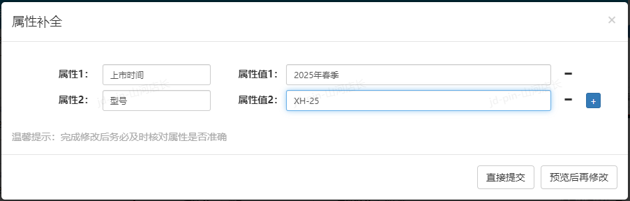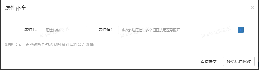 可批量为多个商品补全商品属性,以属性名+属性值的形式填写