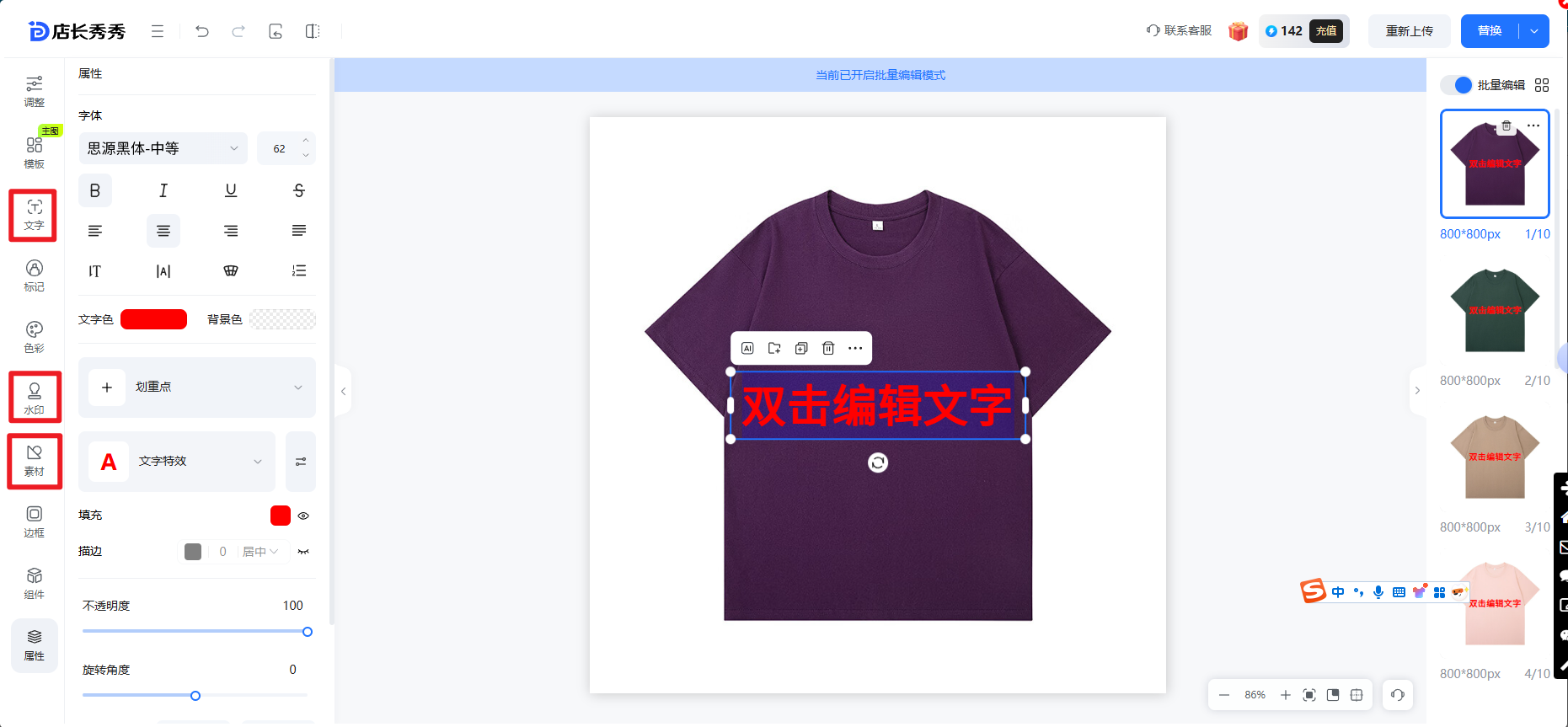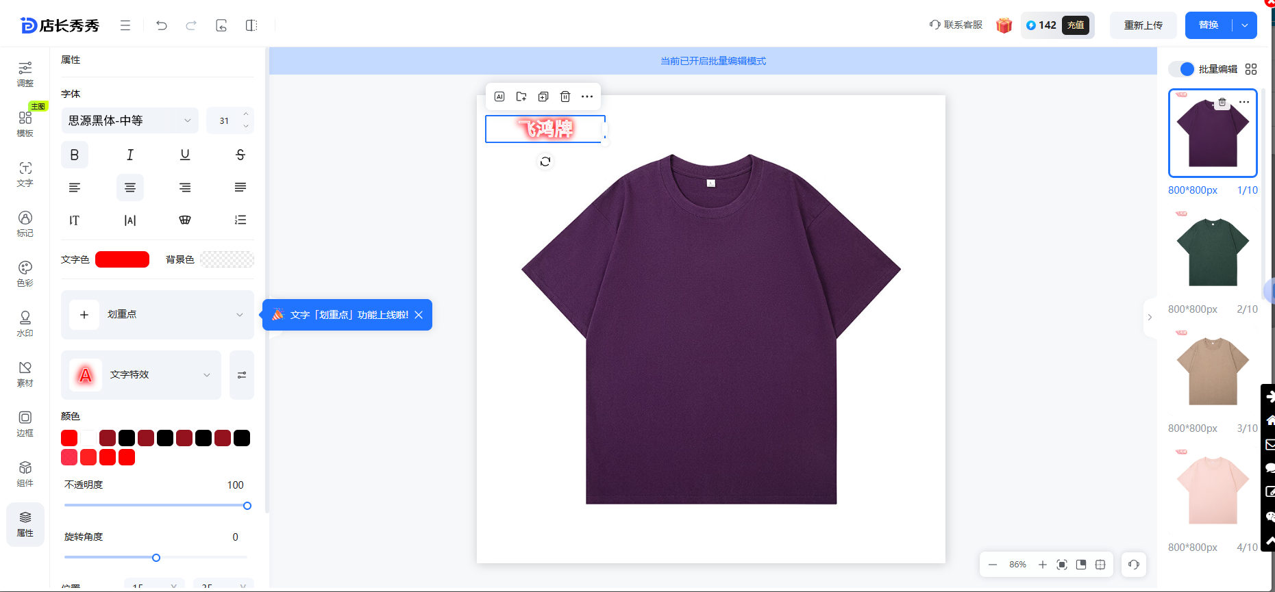 下图以文字为例,添加文字,文字支持修改大小、特效、颜色,可按住随意拖动位置