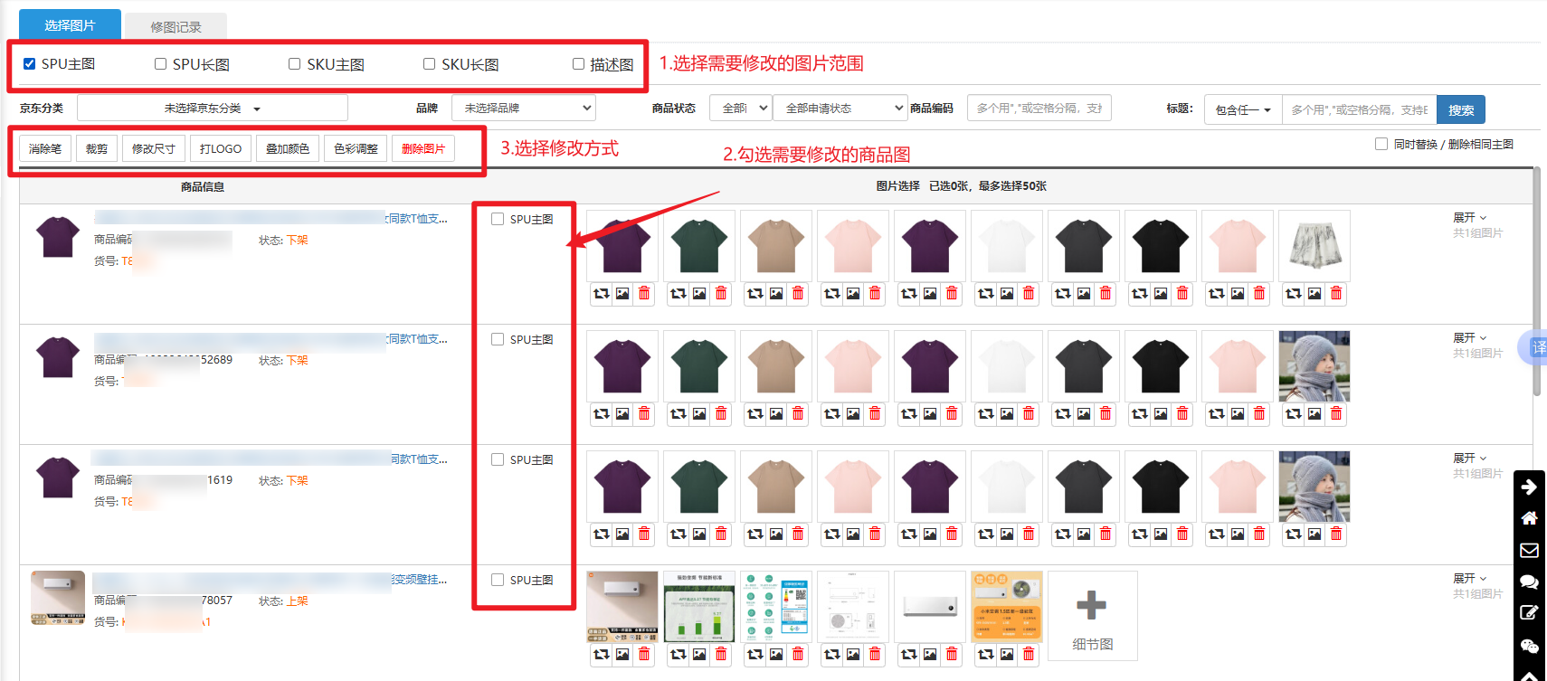 多商品修改图功能可以同时编辑修改多个商品的SPU主图、SKU主图、SPU长主图、SKU长主图以及描述图(即商品详情图)提高图片修改的效率