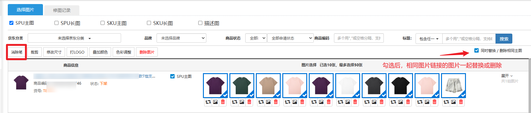 1.选择需要修改的图片范围,如下图所示,需要修改SPU主图,则只勾选SPU主图(至少需要勾选一项,否则图片为空)