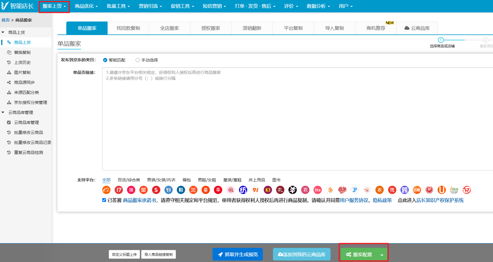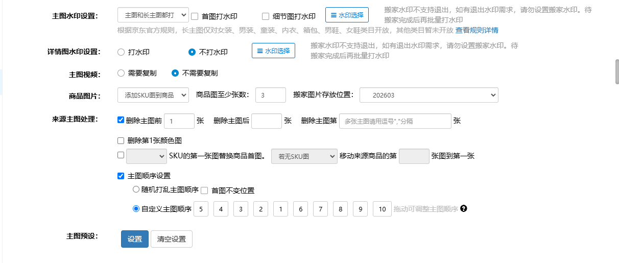 注意点:搬家预设打水印,打上的水印是不支持退出的,如需要给全店商品打品牌logo,可以使用