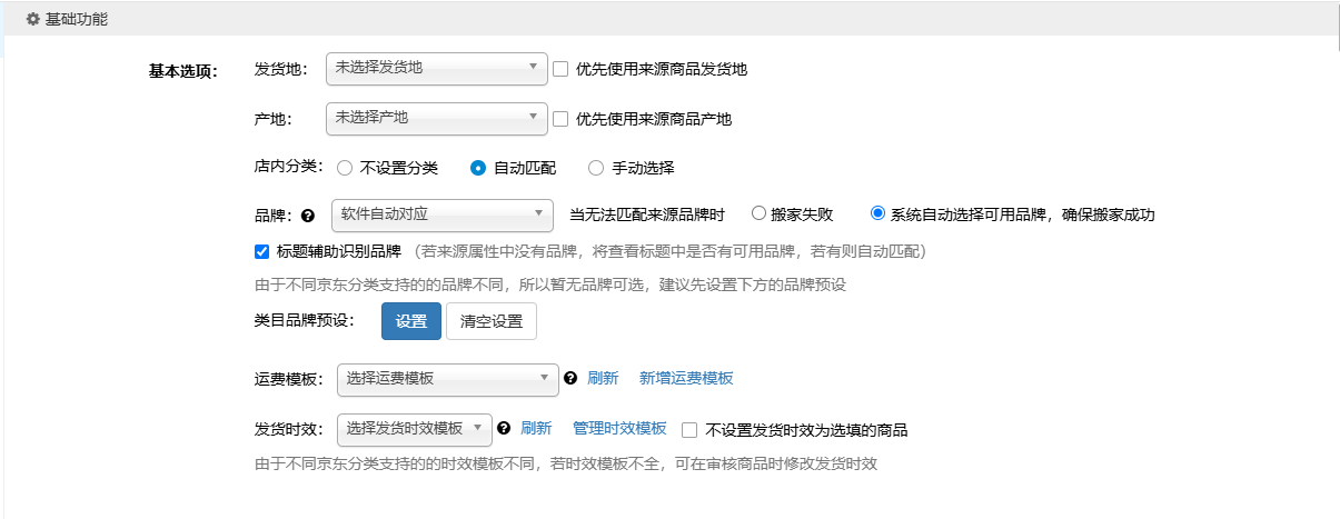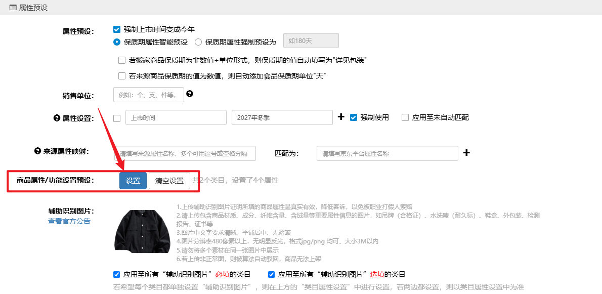 点击商品属性预设,可根据不同的京东分类,提前预设商品属性,搬家铺货会以预设的属性为准