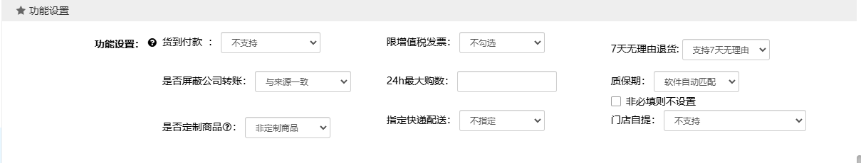 支持预设货到付款、7天无理由、24H最大购买数、质保期等