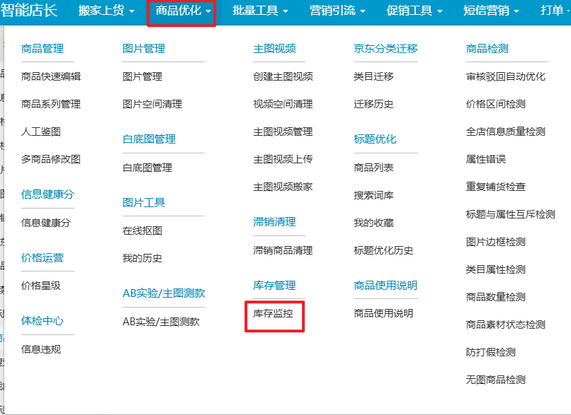 进入软件 - 顶部菜单 - 【商品优化】-【库存预警】