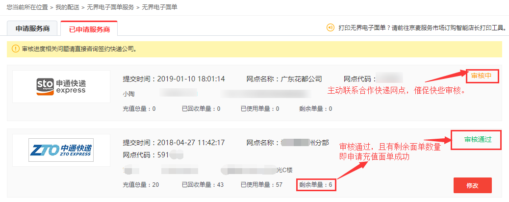 申请提交以后,需自行联系当地快递网点及时审核、及时充值面单号;