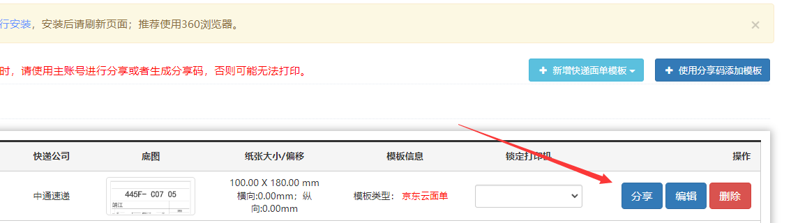 第三步:换用B店铺进入智能店长软件,进入打印设置-快递单模版页面,点击页面右侧上方的【使用分享码添加模版】,弹窗中黏贴输入A店铺的分享码,单击新增。这样A店铺的模版就添加到B店铺中了。