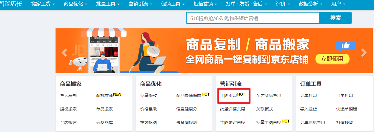 第一步:进入智能店长-->营销引流-->主图水印(如下图)