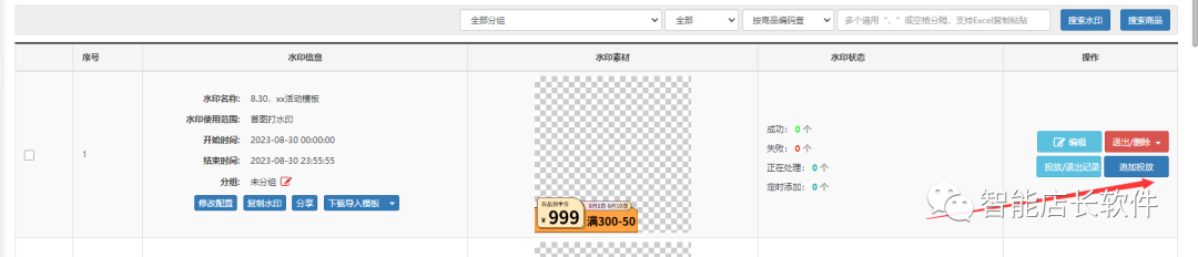 建议名称注明时间,活动名称,并设置水印开始时间和结束时间,如无结束时间 则默认一直投放,设置好后点击保存,然后去投放商品。