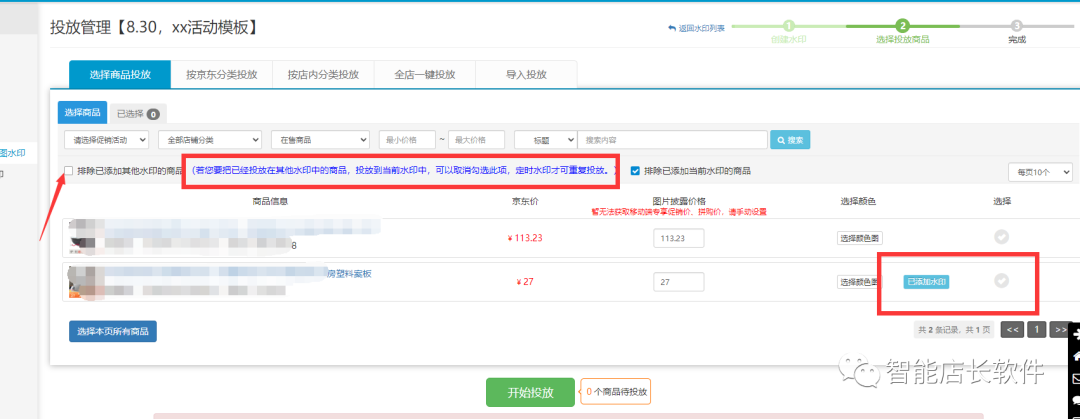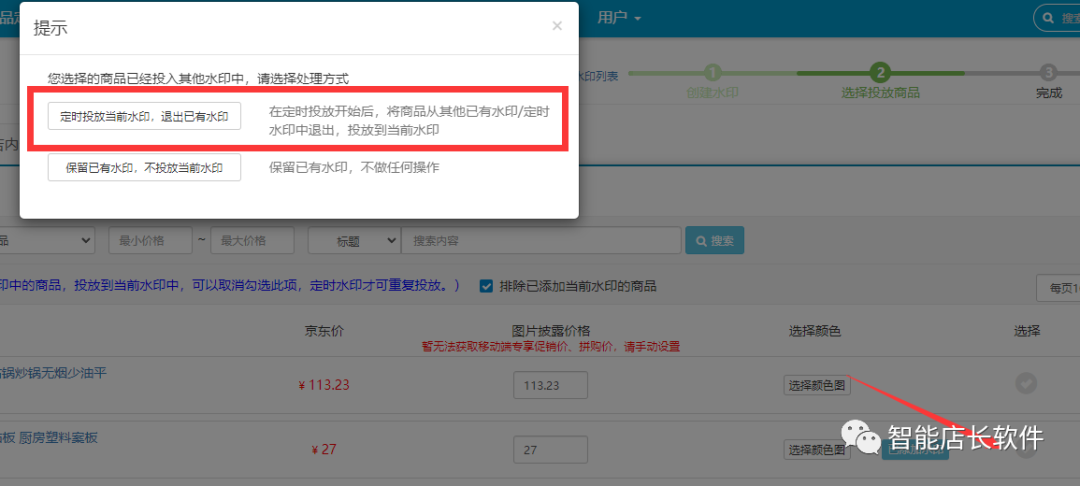 勾选商品后选择定时投放当前水印,退出已有水印,这样子投放商品后,水印处于等待开始的阶段,不会影响正在投放的水印了。