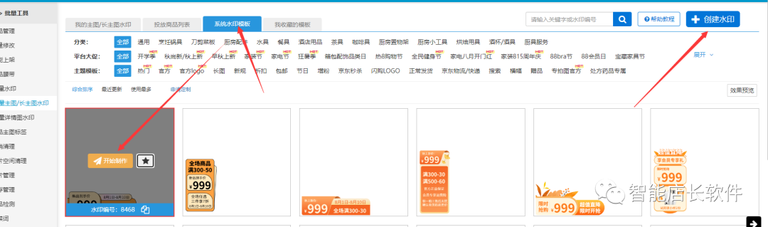 商品已经处于投放过程,我们来设置第二个水印模板,用于第二天使用,点击系统水印模板,选择想要的模板进行制作,或者点击右边的创建水印自行定义