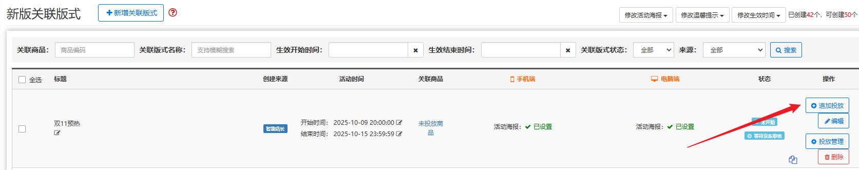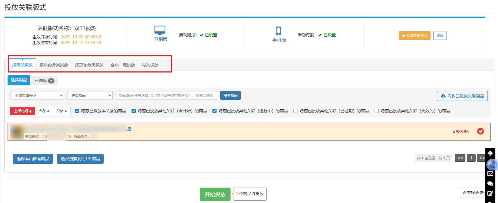 商品可根据筛选下拉框快速选择。选择好商品后可点击开始投放,投放新版关联版式