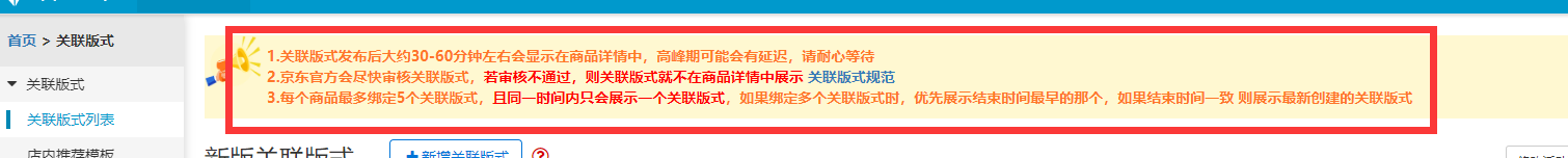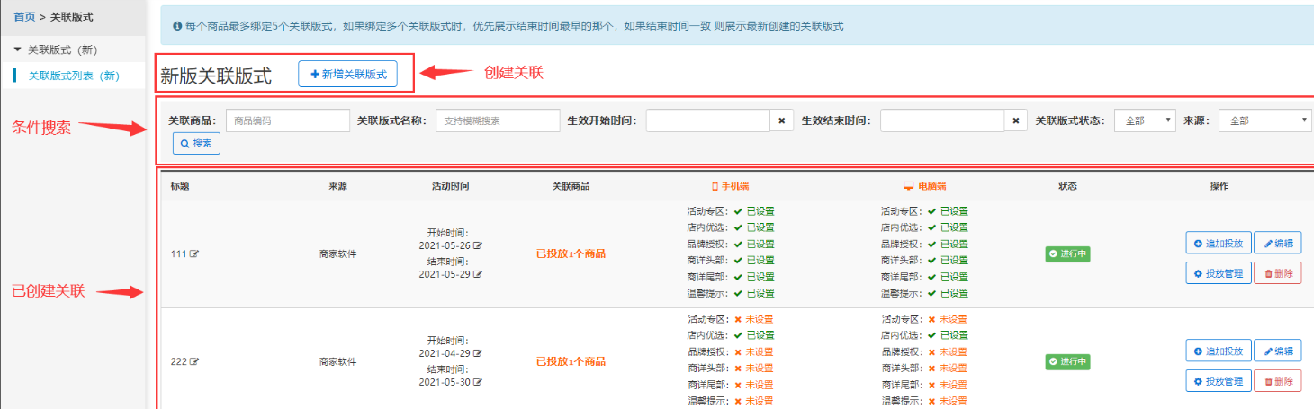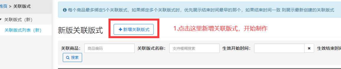 2: 每个商品最多绑定5个关联版式,且同一时间内只会展示一个关联版式