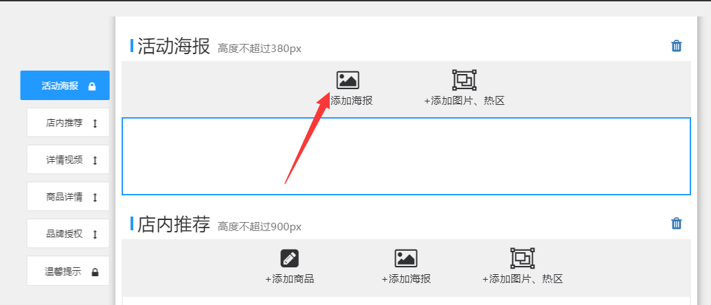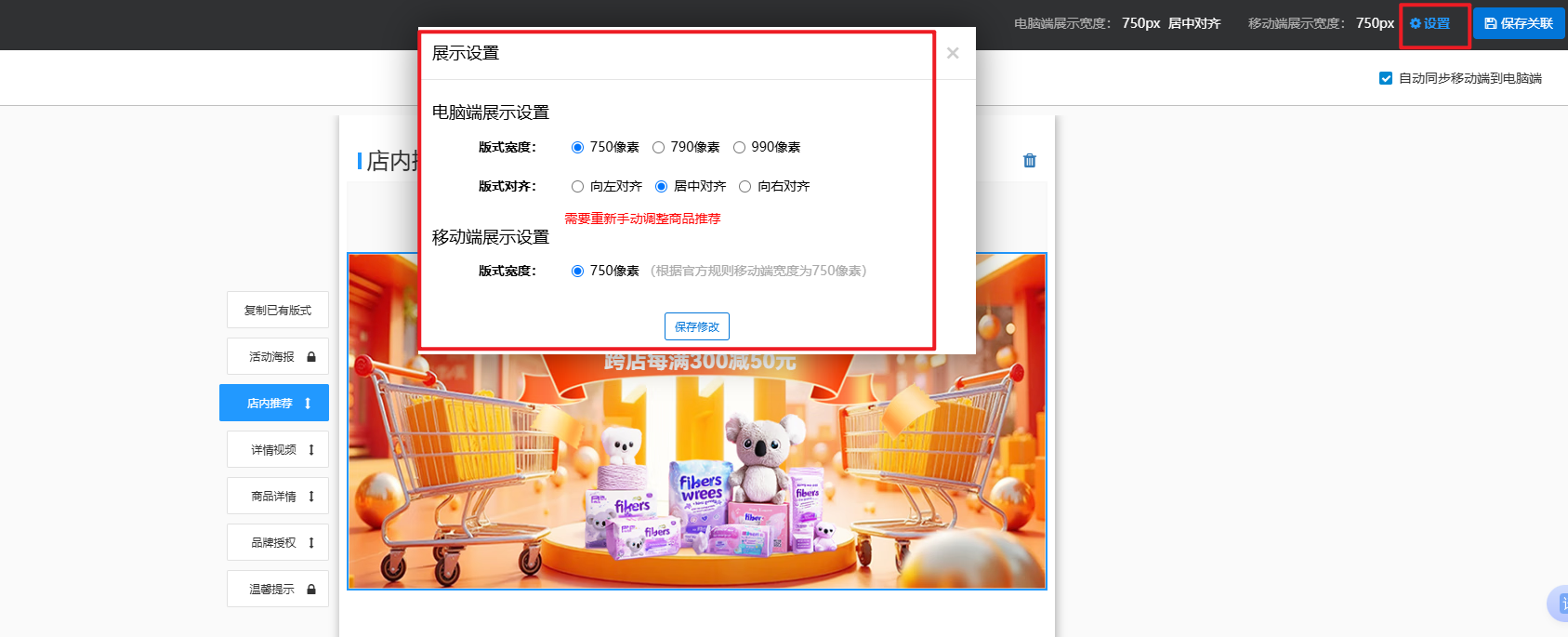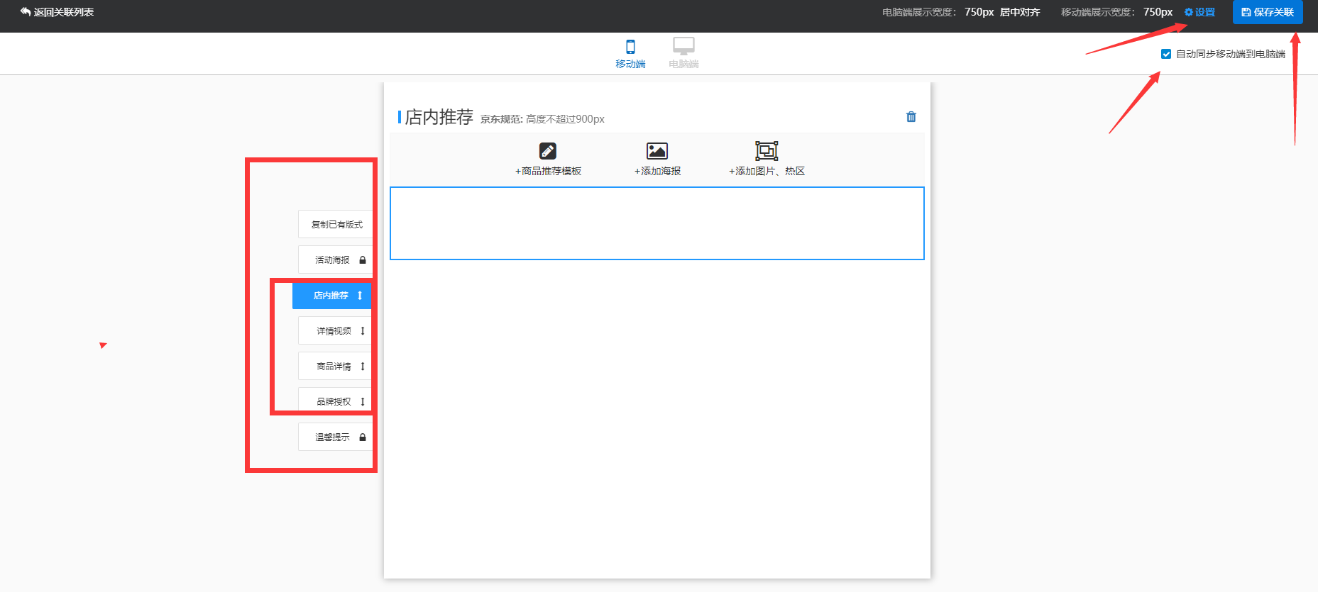 默认设置手机端的话自动同步到电脑端,如无需同步请取消勾选,活动海报与店内推荐均支持设置热区,其他模板不支持设置。