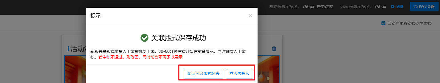 1:关联版式的更新较慢,会遇到投放后过30分钟左右陆续更新的情况,时间没到可耐心等待;